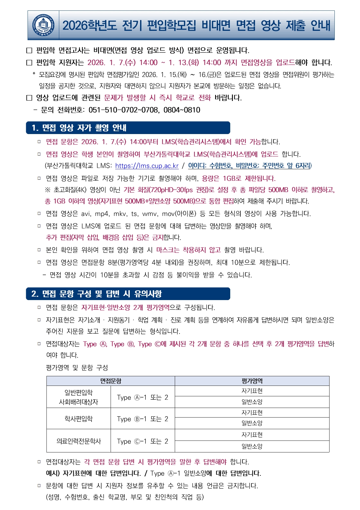 2026학년도 전기 편입학 비대면 면접 영상 제출 안내